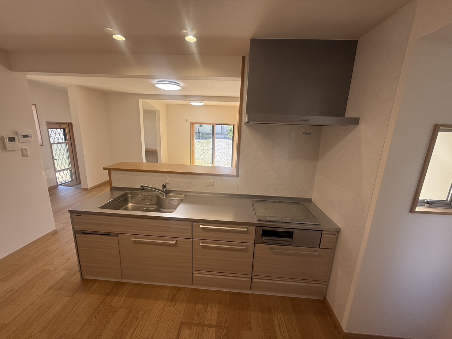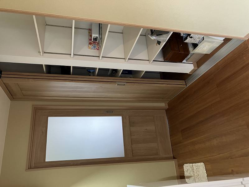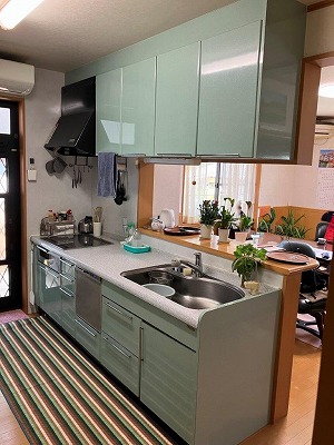 以前のキッチンはグリーン色でしたが今回はグレージュアッシュというカラーを選ばれ落ち着いた雰囲気を出しています。 収納力バツグンでお手入れもカンタンと好評です。