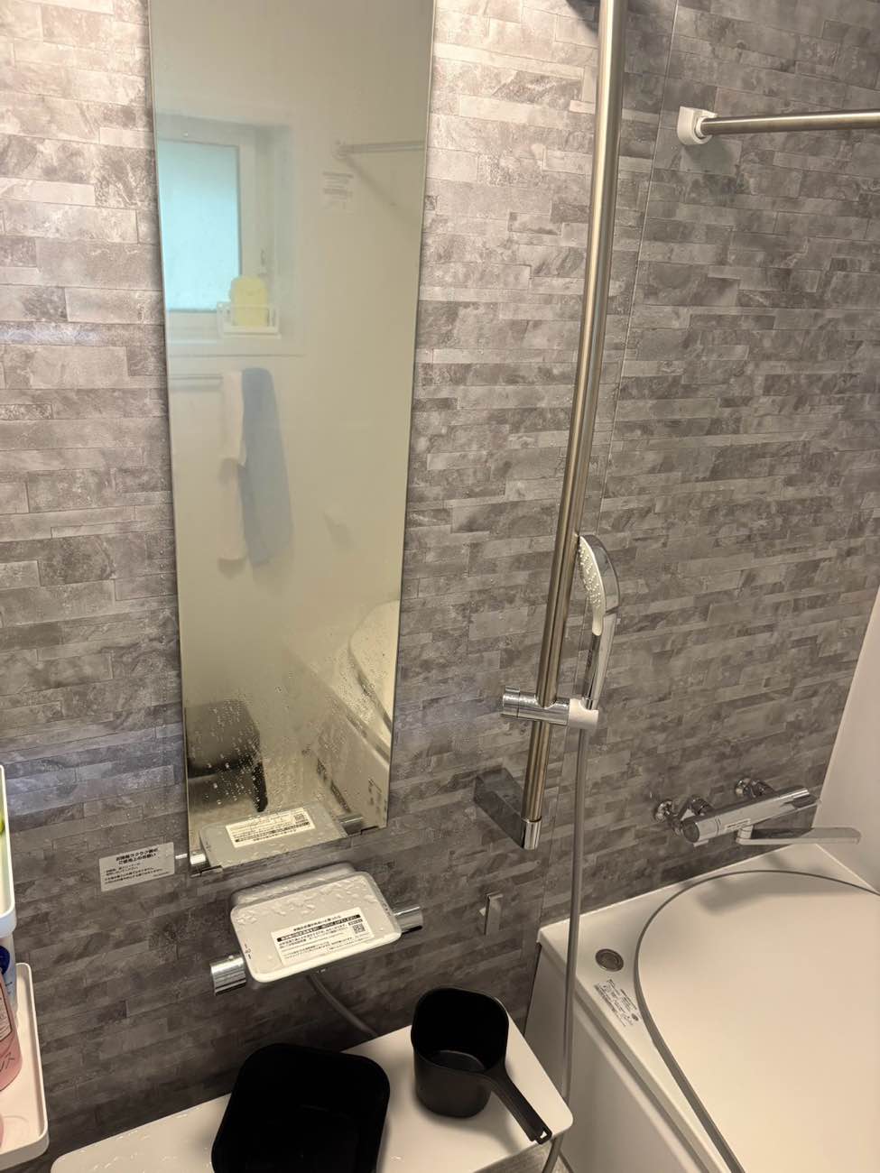 3面鏡でミラーの裏にはたっぷりの収納スペース! ハイバックカウンターとし水栓周りの水垢対策も OK! カウンターは濡れたものと濡らしたくないものをエリアで使い分けできる機能性に優れています。 洗面台下台に小型電気温水器でお湯を供給します。