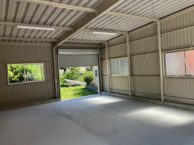 間口:14.5m 奥行:8.2m 高さ3.8m 床面積:119? 内部は、造作し、物置部屋を設置しました。