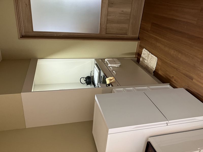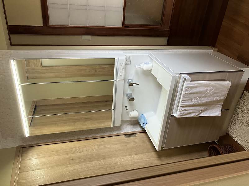 3面鏡でミラーの裏にはたっぷりの収納スペース! ハイバックカウンターとし水栓周りの水垢対策も OK! カウンターは濡れたものと濡らしたくないものをエリアで使い分けできる機能性に優れています。 洗面台下台に小型電気温水器でお湯を供給します。