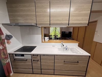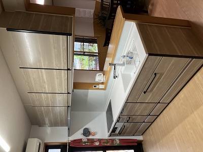 以前のキッチンはグリーン色でしたが今回はグレージュアッシュというカラーを選ばれ落ち着いた雰囲気を出しています。 収納力バツグンでお手入れもカンタンと好評です。
